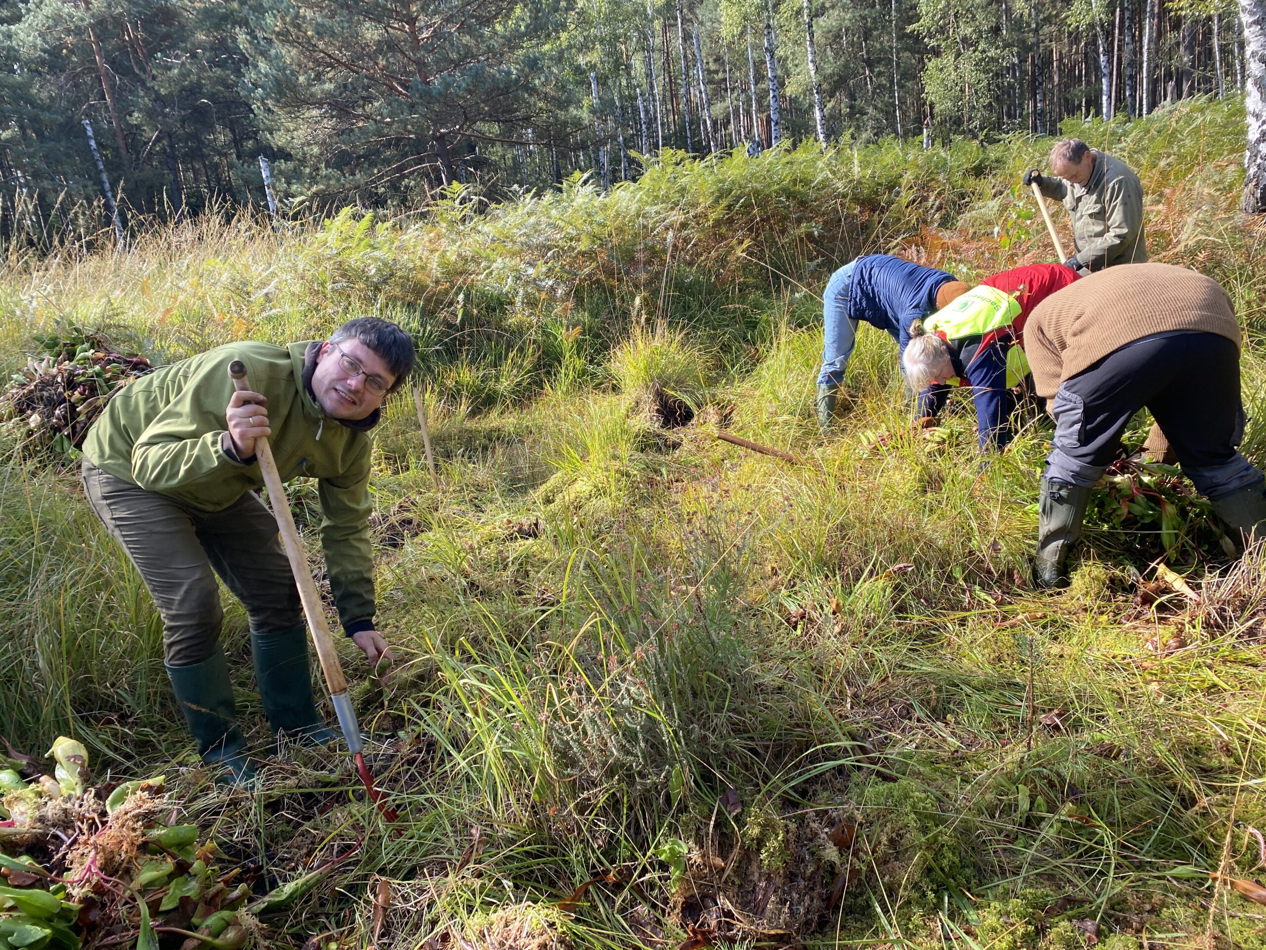 Um diesen wieder Platz zum Wachsen zu geben wurde im Oktober 2024 in enger Abstimmung mit der Naturschutzbehörde des Landkreises Bautzen und Dipl.-Forsting. (FH) Arne Beck in einer Gemeinschaftsaktion des MoSaiKTeiL-Projektes und des Forstrevieres Neukollm, mit Unterstützung der NABU-Regionalgruppe Wittichenau die Rote Schlauchpflanze aus dem Neukollmer Moor entfernt.