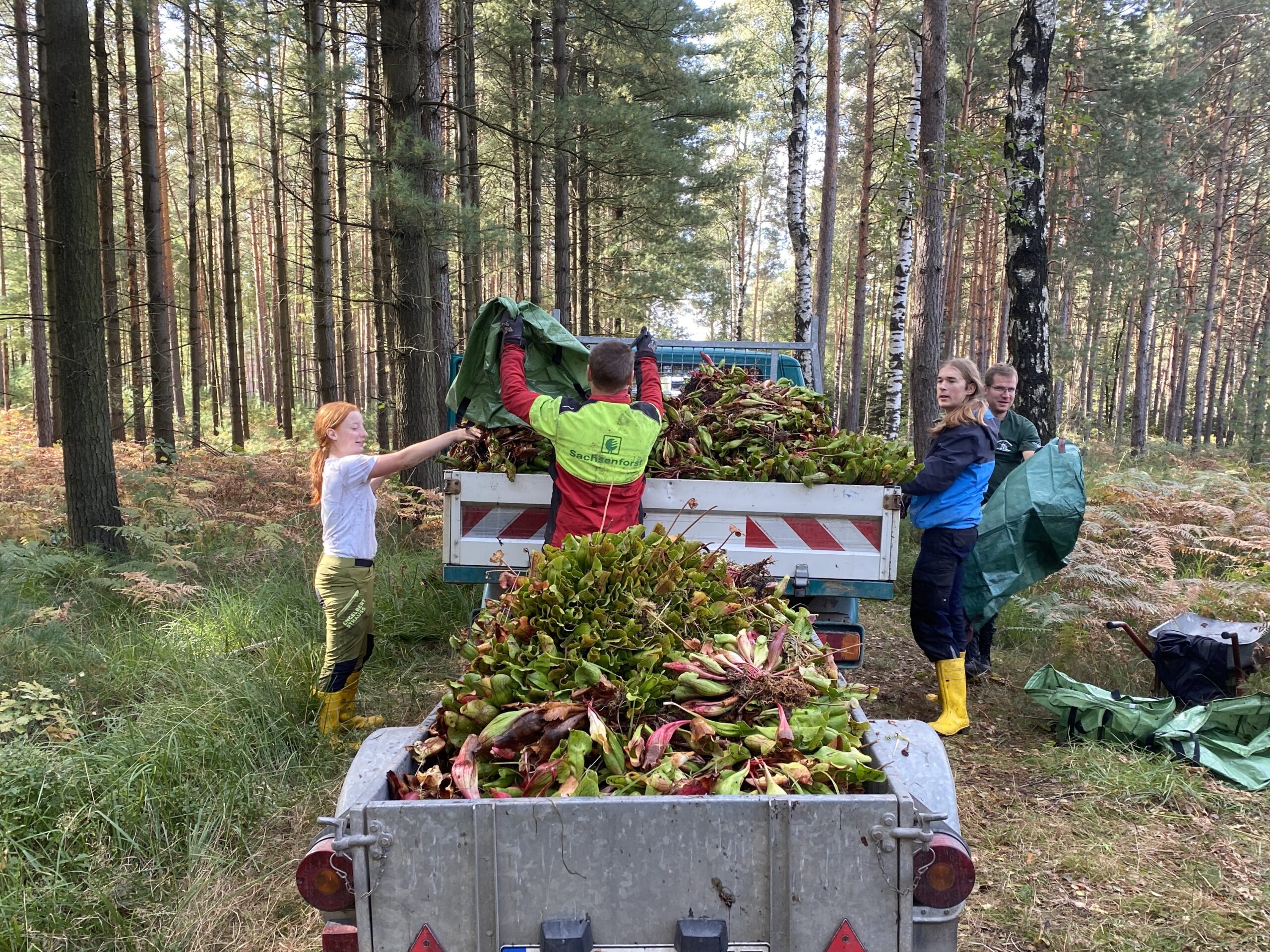 Insgesamt kamen bei der nun durchgeführten Entnahme vier große Anhänger voll Schlauchpflanzen zusammen. In den folgenden 3 Jahren wird diese Maßnahme wiederholt, den zahlreiche winzige Sämlinge der Sarracenia purpurea sprießen bereits aus der Moosauflage hervor.